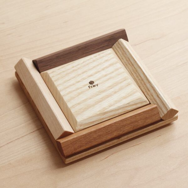 工房で製作しているフルオーダー家具、オリジナル家具の主要木材、ホワイトアッシュ/ハードメープル/ブラックチェリー/ブラックウォルナットの4種類で作られた、フォークレスト4個と大小の木のコースター 各一枚ずつのセットです。